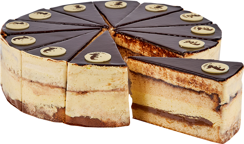 Vanilkovo-piškotový korpus s vanilkovým krémem a karamelovou ganache. Je politý hořkou čokoládou.